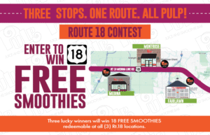 Pulp Juice and Smoothie Bar is having a special Route 18 contest! Stop by one of our Pulp Locations: Medina. Fairlawn. Montrose. Wherever you’re headed on Route 18, Pulp has your back (and your blender)! We’re giving three lucky customers the chance to enjoy 18 FREE smoothies at Medina, Fairlawn, or Montrose Pulp Locations!